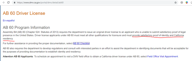 - Распечатать с официального сайта DMV документ, который свидетельствует, что вы можете получить водительсткое удостоверение в Калифорнии, при предъявлении документа удостоверяющего личность, документа подтверждающего ваш адрес и документа I-94 (или аналога). Страница DMV – https://www.dmv.ca.gov/portal/dmv/detail/ab60