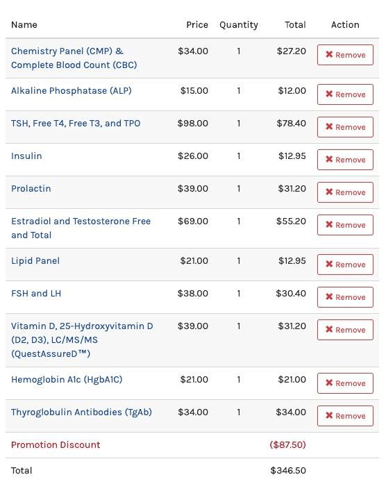 Пример пакет тестов, что я подобрал совместно с техподдержкой ultralabtests.com. Если подбирать нужные мне 22 теста, то они обходятся отдельно порядка 995$. Даже когда я самостоятельно нашел пакеты тестов, покрывающие сразу несколько из моего списка, мне удалось достигнуть лишь 445$. Техподдержка помогла сделать 346.50